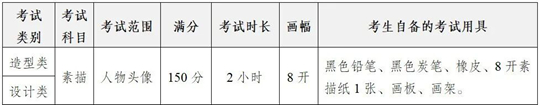 考試用具要求:①鉛筆和炭筆不得使用黑色以外的其他顏色;②8開素描紙要求:180克,漂白色、細紋,尺寸27CMX39CM,不得有顏色,不得出現暗紋、邊框、界格、品牌標印、折痕等標記,長寬尺寸誤差不得大于1厘米;③畫板、畫架須干凈整潔,無任何圖文;④考生不得使用規定以外的考試用具。