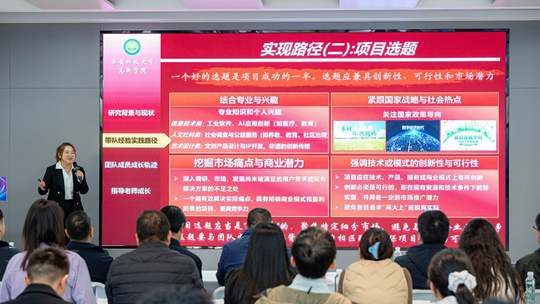 第十九屆“挑戰杯”國賽三等獎指導老師李華君為在場師生帶來一場干貨滿滿的分享。其獲獎項目以“特色產業融合助推縣域經濟高質量發展”為主題,聚焦陜南3市11縣茶產區,組建跨工程造價、視覺傳達、網絡與新媒體、計算機等多學科團隊,歷經三年深入調研,從產品、技術、文化、系統四個維度推動茶產業升級:在產品上融合安康富硒茶與涇陽茯茶工藝,研發出金花菌更豐富、健康價值更高的富硒茯茶;在技術上設計新型自動控溫控濕發花裝置,實現降本增效與發花均勻;在文化上挖掘“貢茶文化”“茶馬古道”內涵,打造特色文創包裝;在系統上運用全生命周期成本管理方法優化茶產業園區建設,并構建“內容+技術+渠道”立體傳播矩陣擴大品牌影響。該項目不僅為地方茶產業注入新活力,也構建了一套可復制、可推廣的鄉村振興數字化解決方案。李華君老師從選題立意、細節打磨,到跨學科協作與團隊心態管理,全面拆解競賽關鍵環節,傾囊相授實戰經驗,為學生們搭建起從校園學習走向國賽舞臺的堅實橋梁。