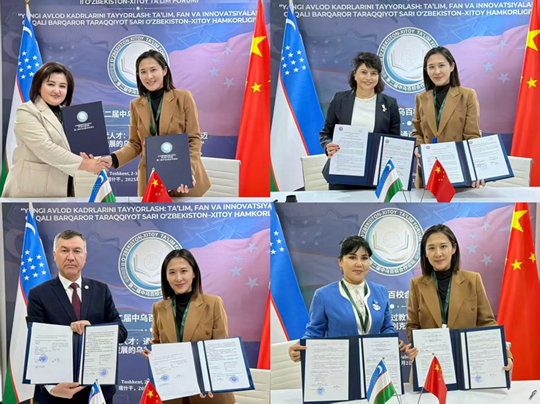 論壇期間,張晨副院長與烏茲別克斯坦國立世界語言大學(xué)等10余所高校達(dá)成合作共識(shí)并簽署合作協(xié)議。為中烏兩國高校在人才培養(yǎng)、學(xué)術(shù)交流、語言培訓(xùn)、文化互通等方面合作奠定了良好的根基。