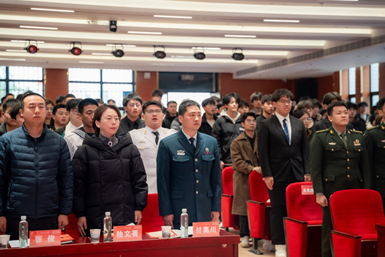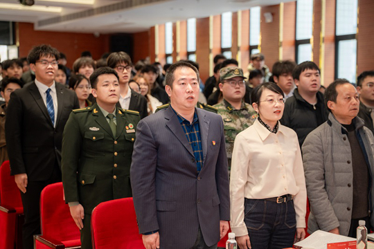 長安區武裝部副部長付離川,黃良街辦專武干事張俊,西安科技大學高新學院黨委書記劉琳,學院黨委工作部、黨委學生工作部、馬克思主義學院、保衛與后勤保障處、學生處、就業與創業辦公室負責人,各二級學院負責人、輔導員代表,各學生組織代表,2025年退役復學學生、退役軍人志愿服務隊全體隊員及意向應征學生代表齊聚現場,共同參與本次大會。大會在莊嚴的國歌聲中正式拉開帷幕。
