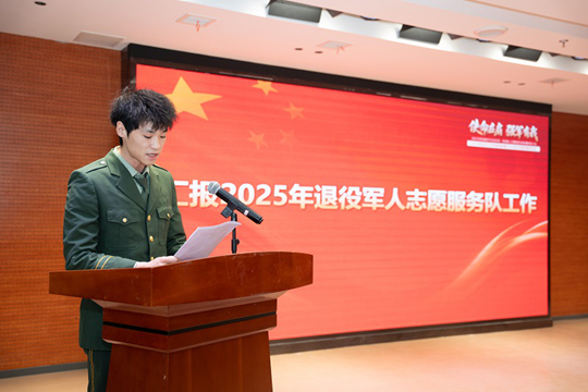 第二屆志愿服務隊負責人孫澤云發言,他總結了2025年退役軍人志愿服務隊工作,并梳理了服務隊過去一年圍繞核心主題策劃,并成功實施的多項志愿活動,如國防教育政策宣講、軍事技能訓練、國防知識宣傳等,并表示今后退役軍人志愿服務隊將繼續努力,為退役大學生服務事業貢獻力量。