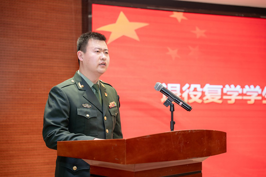 原服役于中國人民解放軍中部戰區某直屬單位的習直代表退役復學學生發言,他談到軍營生涯留給了他為國奉獻、攻堅克難、絕對忠誠的精神印記,這是他一生不可磨滅的寶貴財富。退役返校后,他深切感受到學院對退役復學學生成長的關心與支持,對此他表達衷心感謝。他表示,未來將始終保持軍人作風,深耕專業學習,積極投身志愿服務,同時他勉勵各位退役復學戰友,在校園這一新“戰場”上勤學苦練、勇擔使命,為國家富強與民族復興貢獻青春力量。