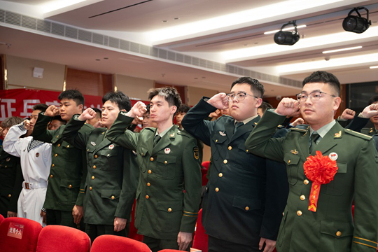 張子涵代表新一屆退役軍人志愿服務隊發言,他感謝領導、老師和同學們的信任與支持,表示將傳承“退伍不褪色,奉獻新時代”的精神與全體隊員一道傳承軍人本色,聚焦服務實效,凝聚團隊力量,擦亮團隊品牌,以忠誠堅守與熱忱擔當,為學院和社會貢獻青春力量,不負重托帶領退役軍人服務隊邁上新臺階。發言最后,他帶領全體退役軍人重溫入伍誓詞,“若有戰,召必回”的鏗鏘誓言響徹會場。