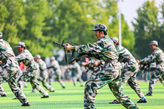 升旗儀式后,軍訓匯報表演正式開始。在激昂的分列式進行曲中,2025級新生組成的各方隊邁著整齊劃一的步伐,昂首闊步走過主席臺。他們身姿挺拔、精神抖擻,眼神中滿是堅毅與自信,每一個擺臂、每一次踢腿都精準有力,充分展現了為期數周軍訓的豐碩成果。隨后的科目匯報中,新生們依次展示了警衛拳、棍術、刺殺操、匕首操等。新生們規范的動作、昂揚的風貌贏得了現場師生的陣陣掌聲,彰顯了當代青年學子不怕苦、不怕累的優良作風,踐行了“刻苦訓練樹新風,艱苦磨練強意志”的軍訓誓言。