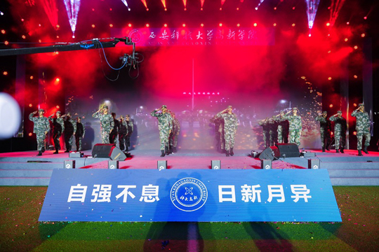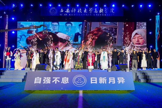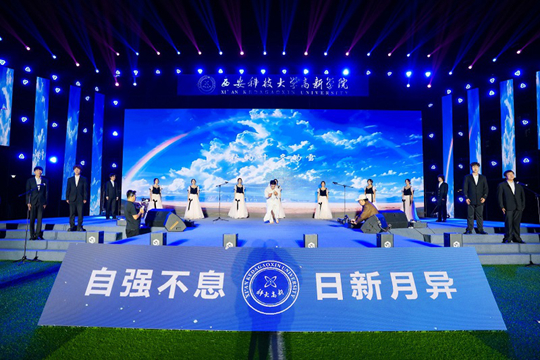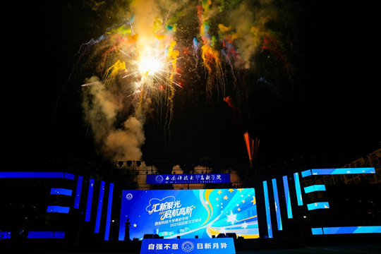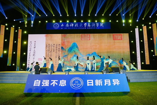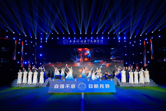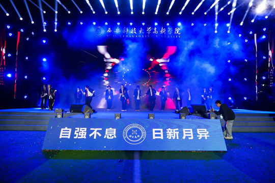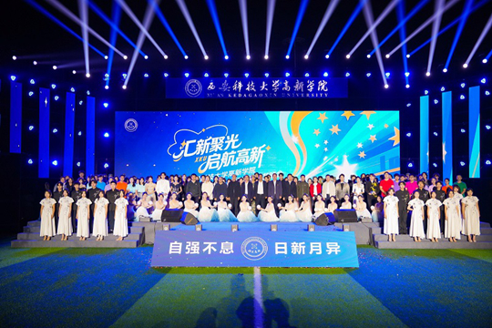 2025年9月24日晚,以“匯新聚光,啟航高新”為主題的西安科技大學(xué)高新學(xué)院2025級迎新文藝晚會在北校區(qū)體育場隆重舉行。晚會現(xiàn)場星光璀璨、氣氛熱烈,學(xué)院領(lǐng)導(dǎo)手持“高光時刻新想事成”“今天C位出道未來由你定義”等創(chuàng)意手舉牌,在繽紛彩屑中為晚會點(diǎn)贊助力;參演人員與身著迷彩服的學(xué)生、身著禮服的國旗班成員在“匯新聚光 啟航高新”的主題背景前合影留念,盡顯校園多元風(fēng)采。學(xué)院領(lǐng)導(dǎo)、各職能部門負(fù)責(zé)人、教師代表、往年畢業(yè)的校友與全體2025級新生歡聚一堂,共同觀看了這場青春盛宴。