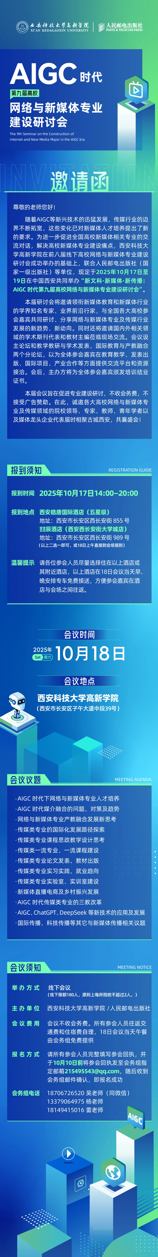 為破解這一時代課題,2025年10月17日至19日,西安科技大學高新學院聯合人民郵電出版社等權威機構將共同主辦“新文科·新媒體·新傳播:AIGC時代第九屆高校網絡與新媒體專業建設研討會”。