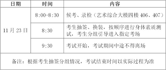 本次考試為該專業職業技能考試全部內容,不另行安排理論考試。考試內容包括身體素質測試(150分)、樂感能力測試(20分)、表演能力測試(80分)、語言表達能力測試(50分),滿分為300分,成績按實際得分計入總分。