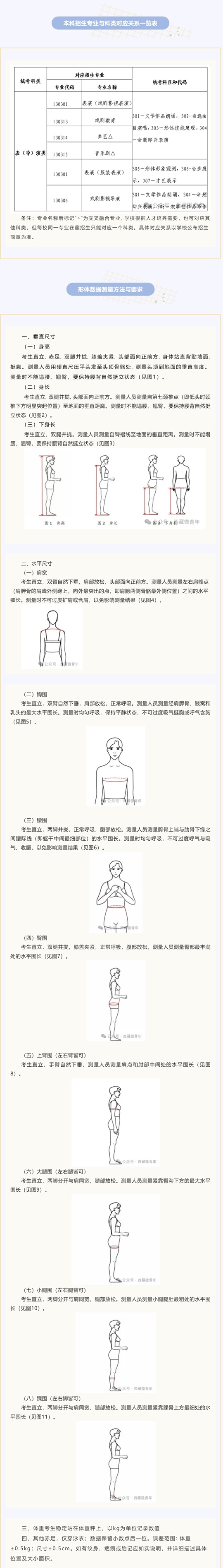 1.形體形象觀測考試目的:主要考查考生形體比例、肢體的勻稱性、協調性及膚質等方面狀況,評價考生專業外部條件及形象氣質等。考試形式與要求:考生先完成形體測量(測量方法與要求見附件),然后5——10人一組進行正面、側面、背面體態展示。要求赤足、著泳裝,其中女生著純色、分體、不帶裙邊泳裝,男生著純色泳褲。