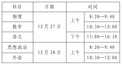 答:各學(xué)科試卷卷面分值為100分;歷史、地理、化學(xué)、生物學(xué)學(xué)科考試時(shí)長為70分鐘;語文、數(shù)學(xué)、英語學(xué)科考試時(shí)長為90分鐘;思想政治、物理學(xué)科考試時(shí)長為80分鐘。
