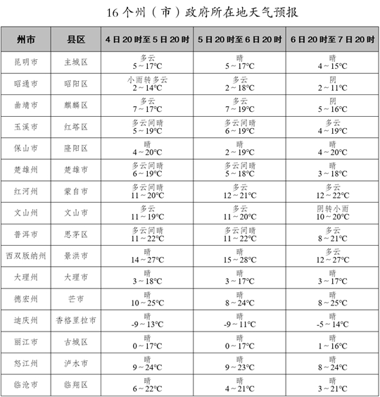 預(yù)計(jì)12月4日20時(shí)至7日20時(shí),昭通市、曲靖市東部、文山州東部、紅河州南部、普洱市東南部多云間陰有小雨,其他大部分地區(qū)晴間多云。