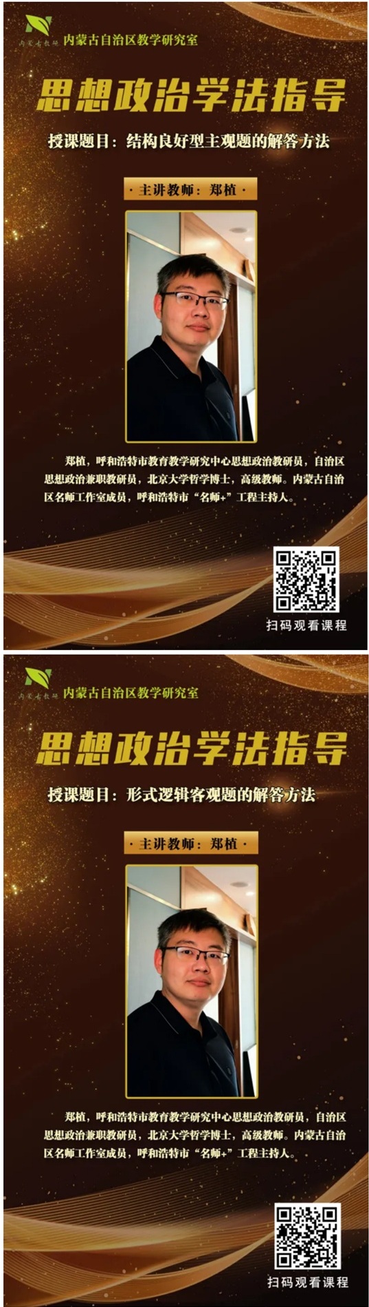 鄭植,呼和浩特市教育教學(xué)研究中心思想政治教研員,自治區(qū)思想政治兼職教研員,北京大學(xué)哲學(xué)博士,高級教師。內(nèi)蒙古自治區(qū)名師工作室成員,呼和浩特市“名師+”工程主持人。