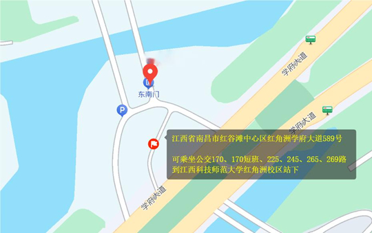 可乘坐公交170、170短班、225、245、265、269路,到江西科技師范大學(xué)紅角洲校區(qū)站下。