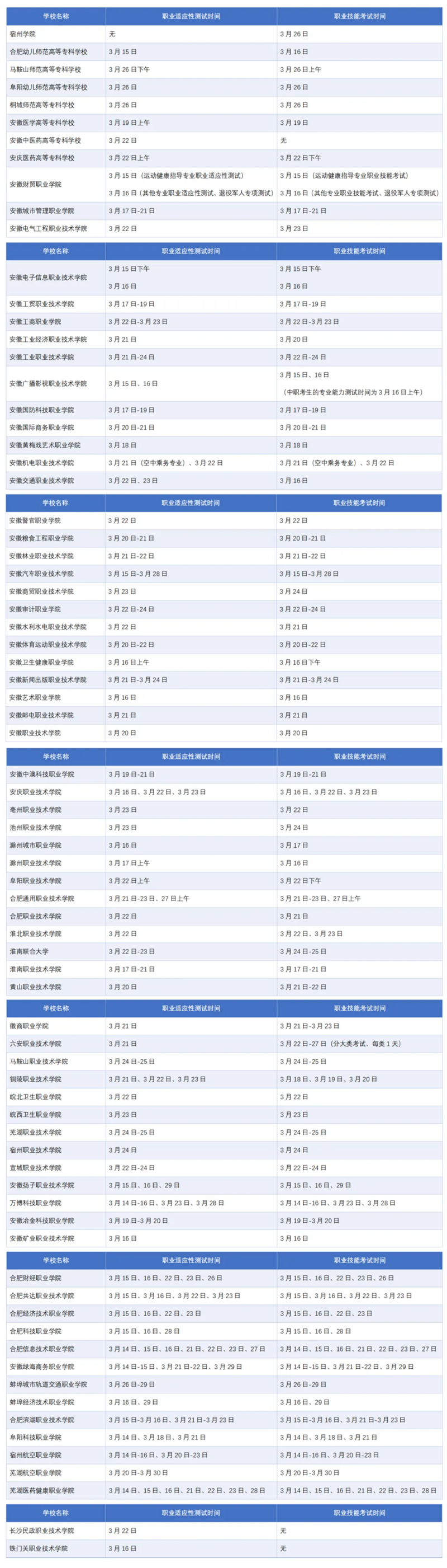 | 安徽省2025年分類考試院校測試(考試)時間一覽表 |