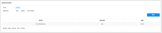 成績排名查詢界面系統為考生提供了成績排名查詢,通過點擊界面右下角的“搜索”按鈕,可查詢考生投檔分數以及報考科類的順位排名,考生還可設置“再選科目”選項后,再次點擊右下角藍色的“搜索”按鈕,查詢在考生報考科類及相應再選科目下的投檔分數及順位排名。(注:院校排名查詢界面僅顯示考生報考科類相關排名,兼報科類排名不顯示。)