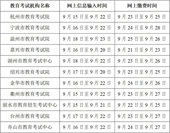 職業技能考試分理論知識和技能操作兩部分,本次報名的是技能操作考試。職業技能操作考試的報名條件等信息詳見各設區市發布的職業技能操作考試報名公告。考生可登錄浙江省教育考試院網站(www.zjzs.net)“考試招生”欄目或點擊文末“閱讀原文”查看有關公告,并按當地公告確定的要求報考。報名流程主要為網上信息輸入和網上繳費兩階段,各地安排見下表。