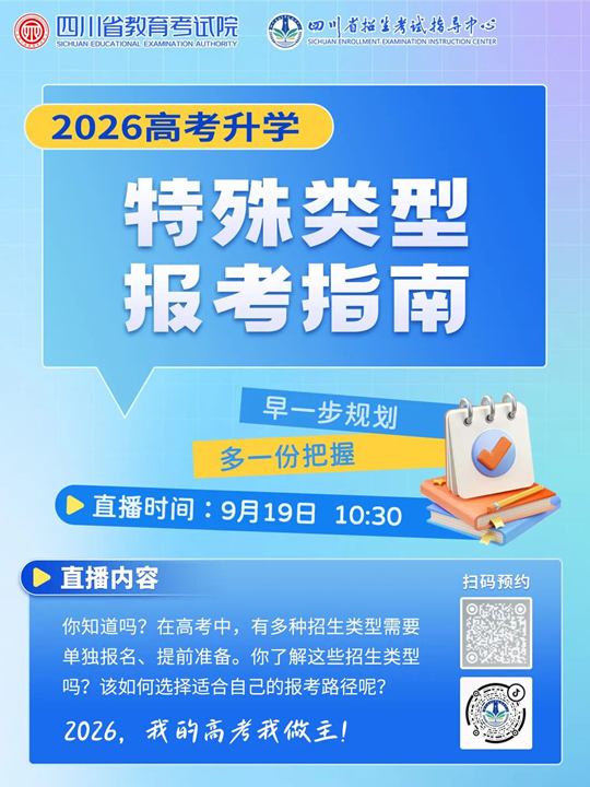 高考,承載著“為黨育人、為國選才”的重要使命,廣受社會(huì)關(guān)注。目前,空軍招飛、海軍招飛、部分綜合評(píng)價(jià)招生高校已發(fā)布2026年招生政策,為助力我省廣大考生、家長把握高考政策動(dòng)態(tài)、規(guī)劃升學(xué)路徑,由四川省教育考試院指導(dǎo)、四川省招生考試指導(dǎo)中心傾力推出的“2026年高考升學(xué)特殊類型報(bào)考指南”直播活動(dòng)將于本周五開播。