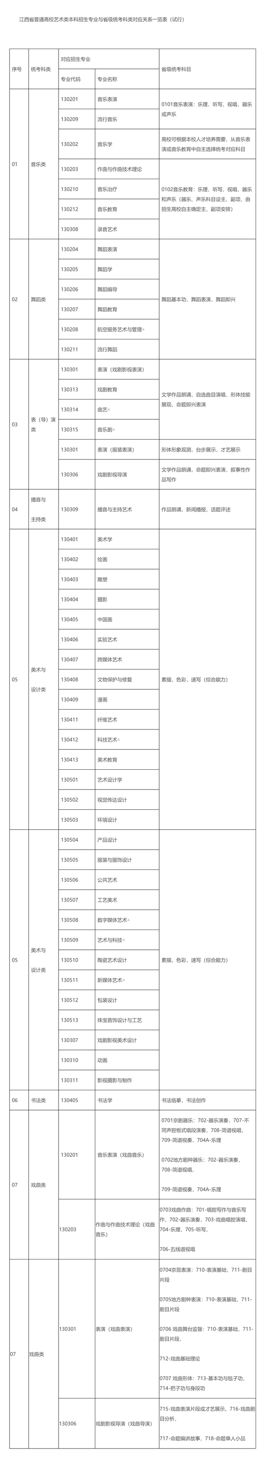 附件:江西省普通高校藝術類本科招生專業與省級統考科類對應關系一覽表(試行)