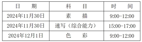 考試包括素描、色彩、速寫(綜合能力)三個(gè)科目,三科總分為300分,其中素描(100分)、色彩(100分)、速寫(綜合能力)(100分)。各科目考試時(shí)間為: