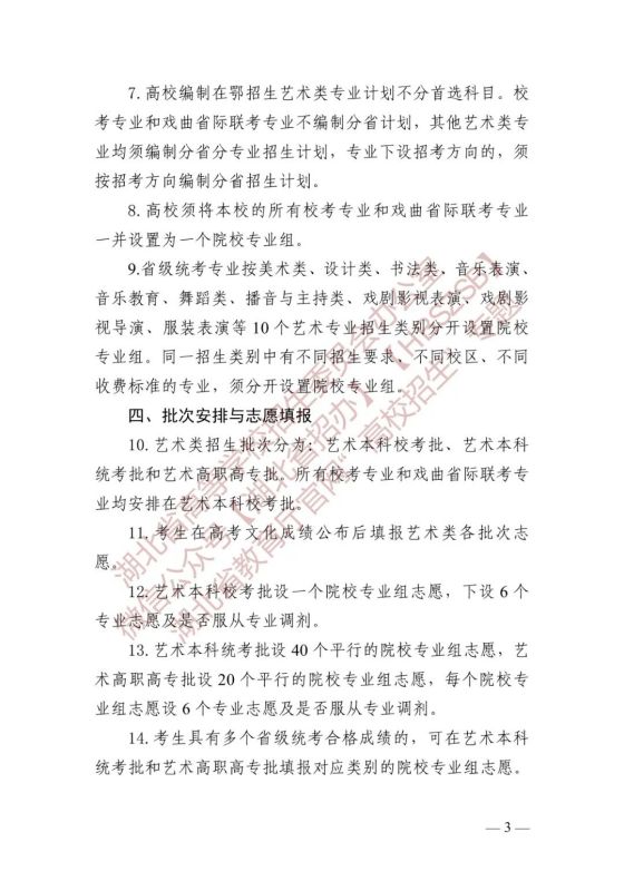 7.高校編制在鄂招生藝術類專業計劃不分首選科目。校考專業和戲曲省際聯考專業不編制分省計劃,其他藝術類專業均須編制分省分專業招生計劃,專業下設招考方向的,須按招考方向編制分省招生計劃。