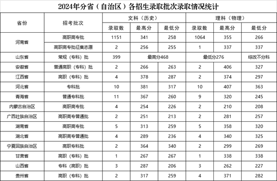 2024年南陽職業(yè)學(xué)院高職招生計(jì)劃6000人,較去年增加200人。其中河南省普通專科錄取2218人,文科最高341分,最低255分,高出省控線70分;理科最高355分,最低266分,高出省控線81分。對口?其浫837人、體育?其浫96人、藝術(shù)專科錄取36人、高職單招錄取2318人,合計(jì)錄取5505人;南陽職業(yè)學(xué)院在山東省、安徽省、江西省、河北省、青海省、湖南省、湖北省、甘肅省、山西省、貴州省、內(nèi)蒙古自治區(qū)、廣西壯族自治區(qū)、寧夏回族自治區(qū)等13省(自治區(qū))共投放計(jì)劃495人,錄取495人;今年錄取新生共11人超過本科線。