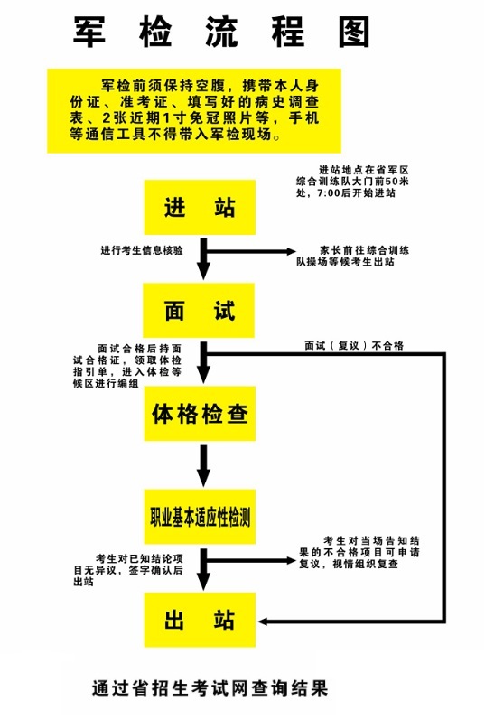 考生進入面試區(qū)后,首先查閱軍檢流程圖和面試分組單,然后到面試待試區(qū)對應(yīng)小組就座,填寫考生信息,依次參加面試。面試合格者,考核組當場發(fā)給《面試合格證》,考生憑《面試合格證》進行體檢登記,并領(lǐng)取體檢指引單。對面試不合格的考生,面試考官現(xiàn)場向考生說明不合格原因?忌魧γ嬖嚱Y(jié)果有異議,可向監(jiān)督復(fù)議組申請復(fù)議,由監(jiān)督復(fù)議組作出最終結(jié)論。面試表格中,需考生填寫高中階段體質(zhì)測試綜合評定成績,請考生提前與就讀學(xué)校確認個人體質(zhì)測試結(jié)果,并對填寫相關(guān)信息的準確性和真實性負責(zé)。