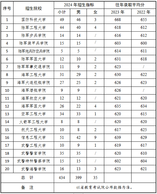 招生計劃:今年,國防科技大學(xué)、陸軍工程大學(xué)、陸軍步兵學(xué)院、陸軍裝甲兵學(xué)院、陸軍炮兵防空兵學(xué)院、陸軍軍醫(yī)大學(xué)、陸軍軍事交通學(xué)院、海軍工程大學(xué)、海軍大連艦艇學(xué)院、海軍潛艇學(xué)院、海軍航空大學(xué)、海軍軍醫(yī)大學(xué)、空軍工程大學(xué)、火箭軍工程大學(xué)、戰(zhàn)略支援部隊航天工程大學(xué)、戰(zhàn)略支援部隊信息工程大學(xué)、武警工程大學(xué)、武警警官學(xué)院、武警特種警察學(xué)院、武警海警學(xué)院等20所軍隊院校在我省招生434人,其中男生399人、女生35人。具體專業(yè)招生計劃、選考科目及體格檢查標準等,在6月份省教育考試院編印的《2024年普通高校招生計劃》中統(tǒng)一公布。