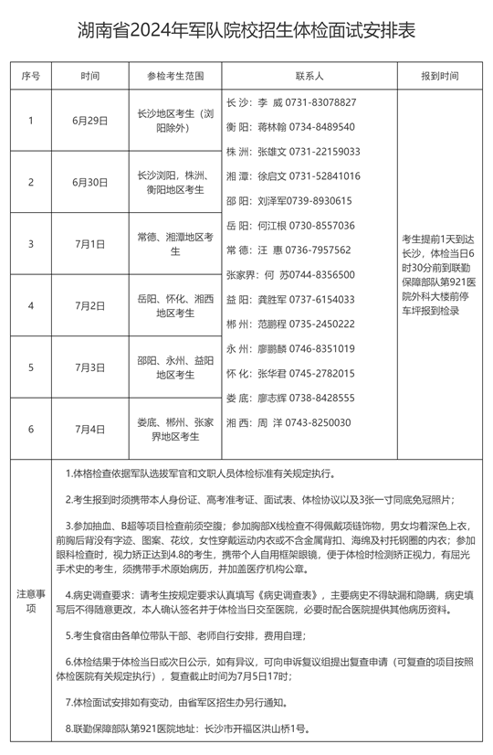 一、湖南省2024年軍隊院校招生體檢面試安排表