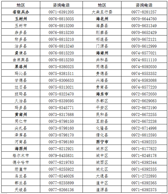 咨詢電話:省征兵辦:0971—6391205