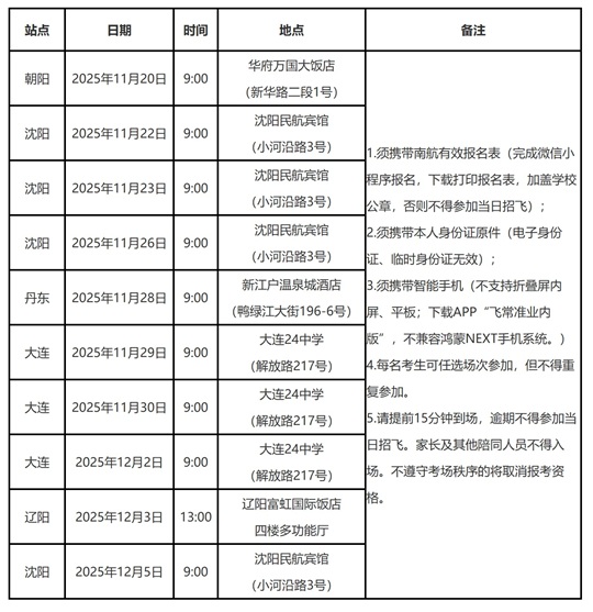 注:1.整體選拔安排說明:招飛相關環節安排綜合測試,包括但不限于飛行職業能力傾向測試、英語測試、綜合面試等考核,通過人員方可進入后續環節,具體安排以當地南航招飛辦通知為準。