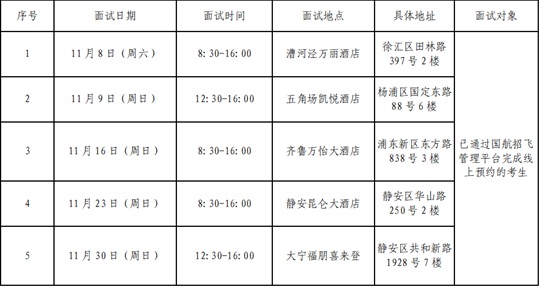 。ǘ╊A(yù)選初檢:登錄“國(guó)航招飛管理平臺(tái)”填寫信息、預(yù)約場(chǎng)次,已預(yù)約考生嚴(yán)格按照預(yù)約時(shí)間參加國(guó)航招飛辦公室組織的現(xiàn)場(chǎng)初檢面試(含飛行職業(yè)能力傾向測(cè)試、英語(yǔ)測(cè)試、面試等);