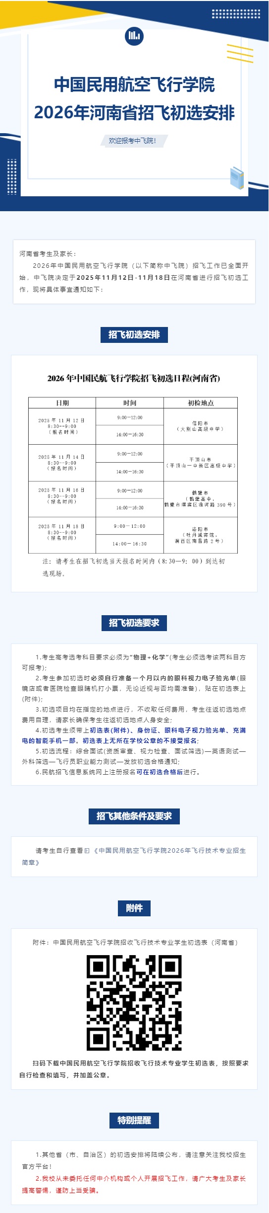 中國民用航空飛行學院2026年河南省招飛初選安排