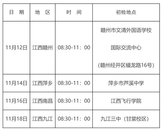 (2)各民航招飛單位將派員在我省4個設區市設點開展初檢,對報名考生進行身份信息審核、目測篩選、初步檢查、英語測試等工作,考生可自行就近就便選擇站點參加初檢。初檢前,考生要詳細閱讀相關高校民航招飛簡章和自薦標準,下載并如實填寫初檢表。
