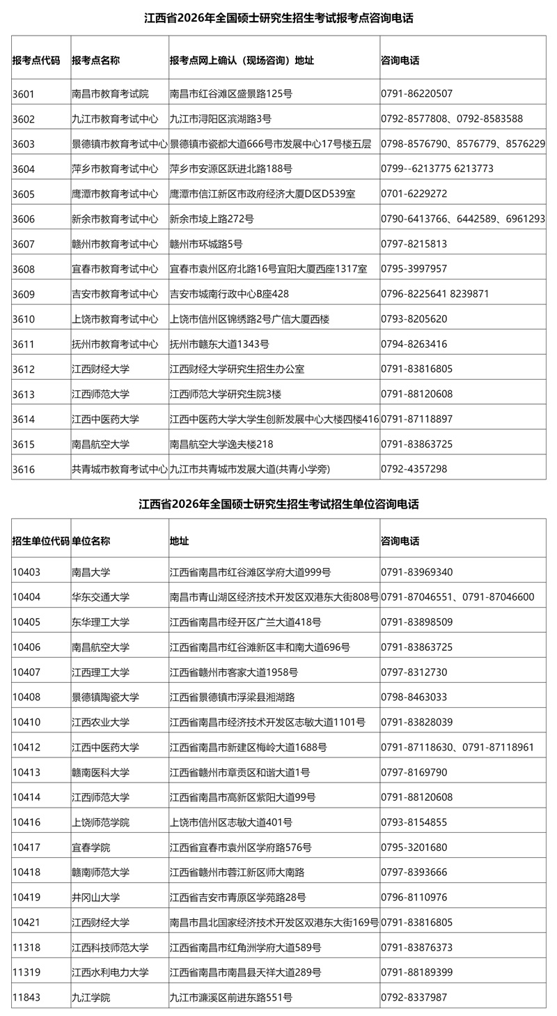 | 江西省2026年全國碩士研究生招生考試報考點和招生單位咨詢電話 |