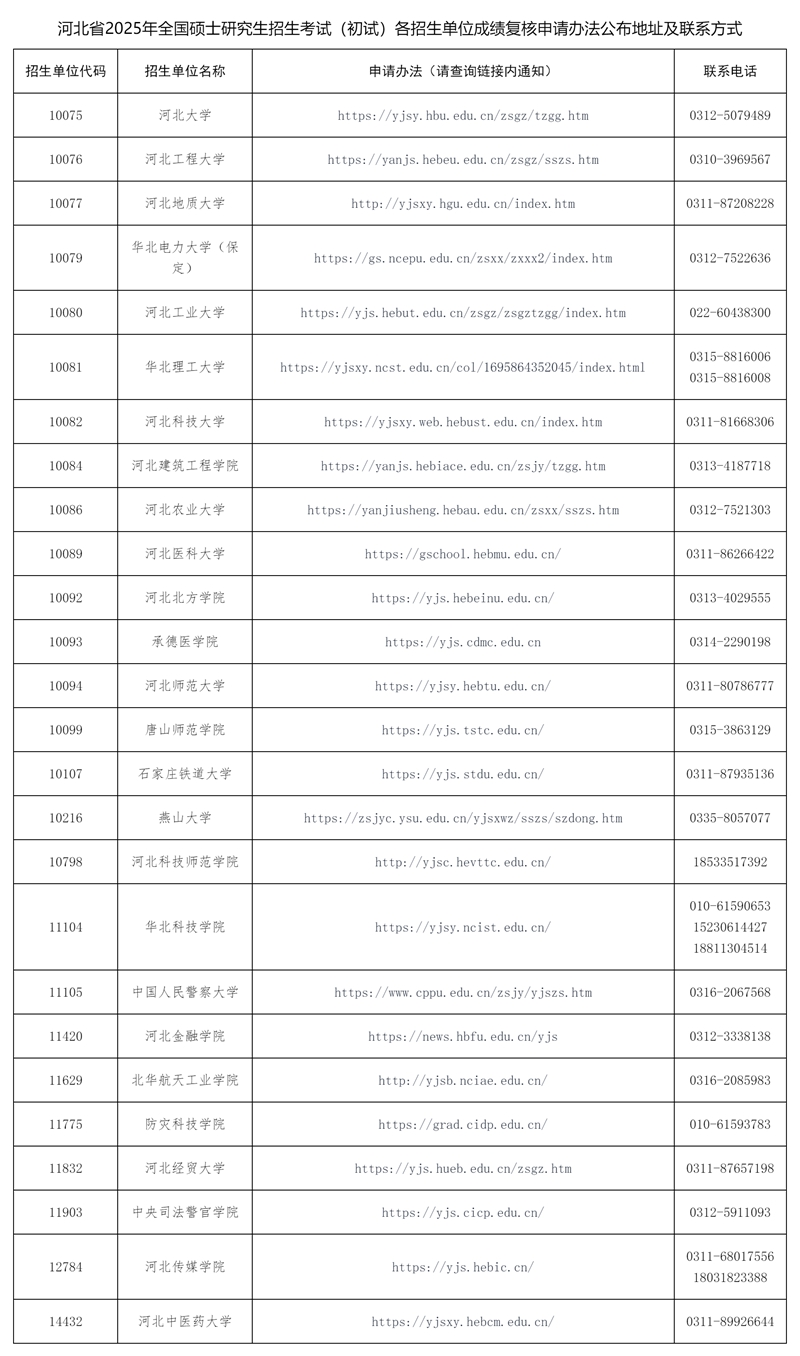 附:河北省2025年全國碩士研究生招生考試(初試)各招生單位成績復核申請辦法公布地址及聯系方式