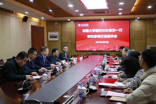 參觀結束后,雙方在會議室進行了交流座談。西安翻譯學院黨政辦公室主任劉軼、教學質量監控與評估處處長柳國勇、學生處副處長馬海洋、宣傳部副部長汪杰參會。