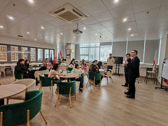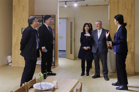 會后,鮑勃·克萊恩一行在西安翻譯學院校領導的陪同下,參觀了外國語言與文化實踐教學中心的英美文化體驗館、西班牙文化體驗館、日韓文化體驗館等地,對學校在拓寬學生國際化視野方面的工作給予高度認可。韋恩·貝利與西安翻譯學院中英國際班學生進行了親切交流,并對2021級13名國際班學生的碩士階段學習進行了具體規劃,目前13名學生均成功獲得哈德預錄取offer。
