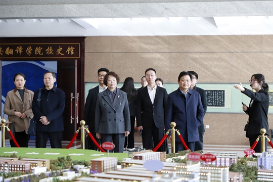 程印學一行在武忠遠等人的陪同下先后參觀了西安翻譯學院沙盤、校史館等地。通過實地了解,充分認識了西安翻譯學院的發展變化以及在育人環境、內涵建設、教育教學、人才培養等方面取得的成效。