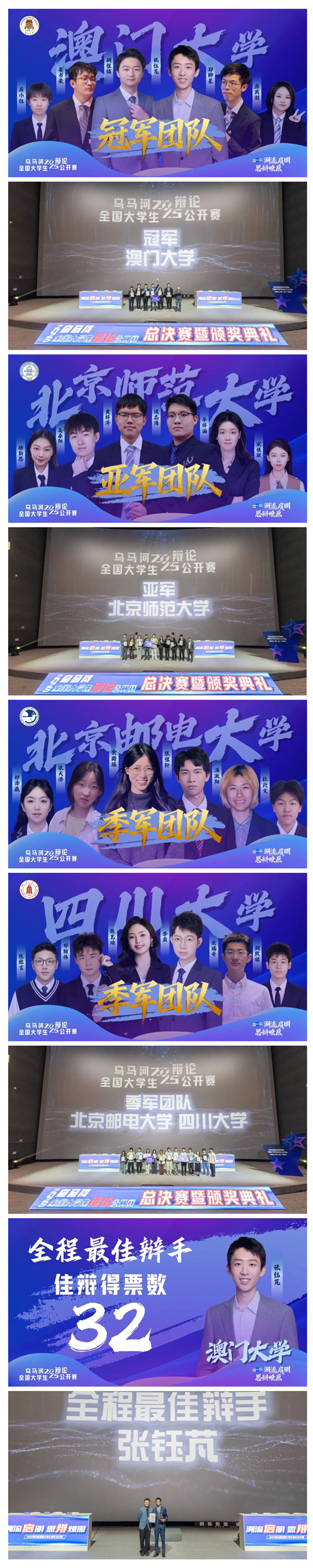 最終澳門大學辯論隊力壓群雄,摘得2025烏馬河·全國大學生辯論公開賽冠軍,其隊明星辯手張鈺芃斬獲全程最佳辯手。北京師范大學獲得亞軍,北京郵電大學與四川大學并列季軍。