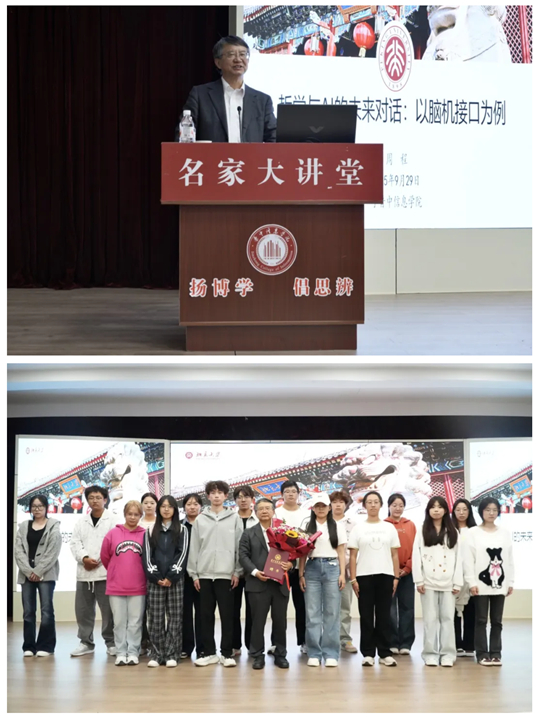 29日晚上,賽事總決賽評委、北京大學哲學系教授周程在圖書館小禮堂為師生帶來了主題為《哲學與AI的未來對話》的專題講座,現場學術氛圍濃厚,互動熱烈。講座聚焦人工智能時代的核心哲學命題,周程教授從腦機接口的技術原理切入,系統介紹了其分類方式與信號采集機制,并展望了其在教育認知與醫療康復等領域的應用潛力。