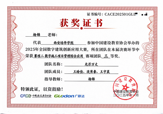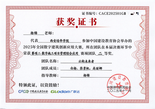 此次獲獎是對西安培華學院數字建筑教學成果的肯定,也是"以賽促學、以賽促教、以賽促創"育人機制的實踐。未來,工程造價專業將深化"新工科"建設,聚焦數字建筑前沿,推動產學研融合,完善實踐教學,培養兼具創新與實踐能力的復合型人才,助力"數字中國"戰略與建筑產業升級。(作者:宋勝男)