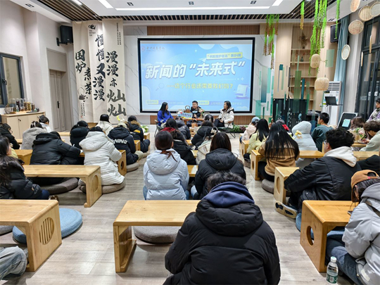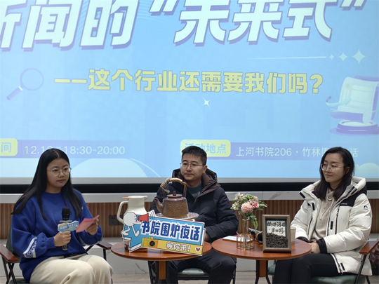 帶著這些疑問,18:30,一場以“新聞的未來式”為主題的圍爐夜話于學(xué)校上河書院206竹林·圍爐夜話空間展開。高珧老師與學(xué)校新聞采寫產(chǎn)業(yè)學(xué)院崔歡歡老師、李金鳳同學(xué)及50余名師生代表共同交流。