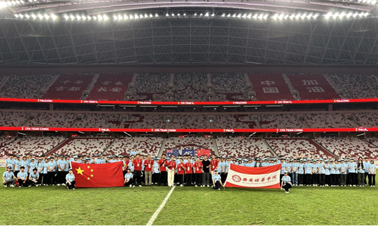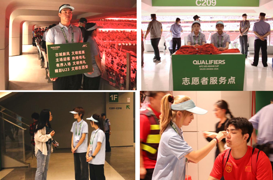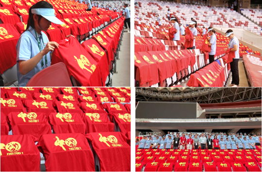 由培華志愿者精心布置的“紅色海洋”成為賽場又一亮點。賽前,志愿者們分組將紅色助威服整齊擺放在6萬座席上;比賽間隙,引導觀眾穿戴助威服,帶動全場形成紅色視覺矩陣,與賽場內的國旗和加油標語相呼應,成為央視轉播畫面中的經典場景。