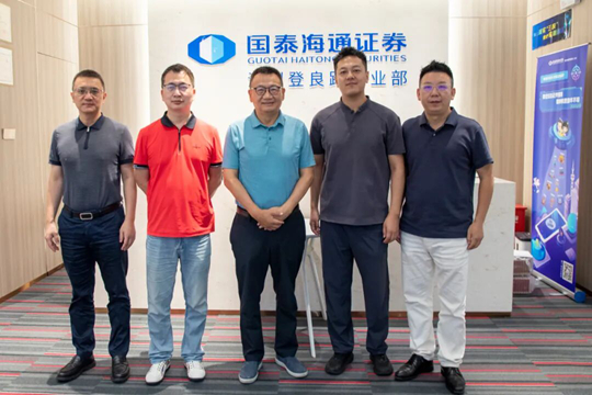 胡建波一行走訪巨翔(右二)所在的國泰海通證券股份有限公司深圳登良路證券營業部