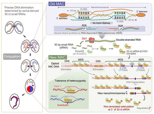elimination in Euplotes vannus”(扇形游仆蟲中母本體細胞系來源的30nt小RNA與染色體斷裂偶聯并精確靶向非轉座子DNA序列使其保留在子代體細胞核中)的研究成果。該研究以海洋纖毛蟲為模式材料,鑒定了一類在有性生殖時期特異性合成的小RNA,系統闡明了這類小RNA的來源、加工機制及其在維持基因組穩定性中的關鍵作用,為理解真核生物中小RNA介導的跨代遺傳信息傳遞提供了全新視角。