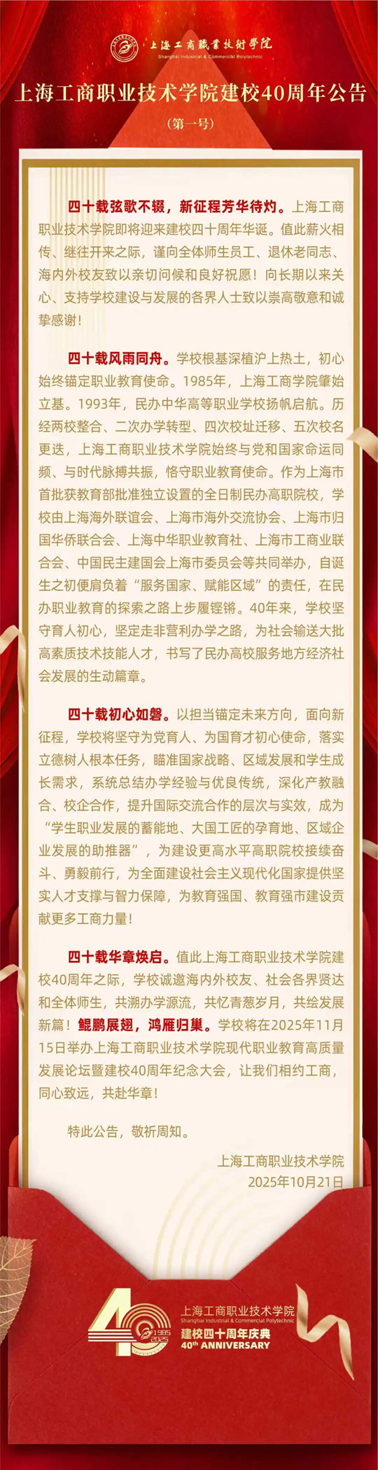 上海工商職業(yè)技術學院建校40周年公告(第一號)