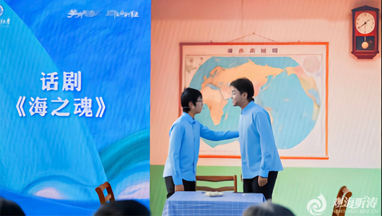 現場藝術演繹精彩紛呈,基礎教學中心藝術系學生、大學生藝術團及海鷗劇社先后帶來合唱《問道滄!、聲韻合頌《藍色夢想》、話劇《海之魂》、情境敘事合唱《藍色暢想》等節目!秵柕罍婧!坊厮輰W校百年辦學初心,《海之魂》再現革命烈士科研報國的英雄事跡,多樣藝術形式讓理論宣講更具感染力,實現了思想引領與審美體驗的同頻共振。