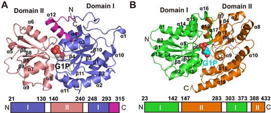 圖1. GpxB-G1P(A)和UgpB-G1P(B)的整體結構
