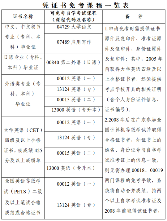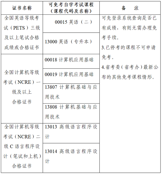 根據(jù)有關(guān)規(guī)定,目前可申請免考自學考試課程的證書包括學歷證書和全國計算機等級考試(NCRE)、全國英語等級考試(PETS)、大學英語四六級考試(CET)的相關(guān)等級證書。